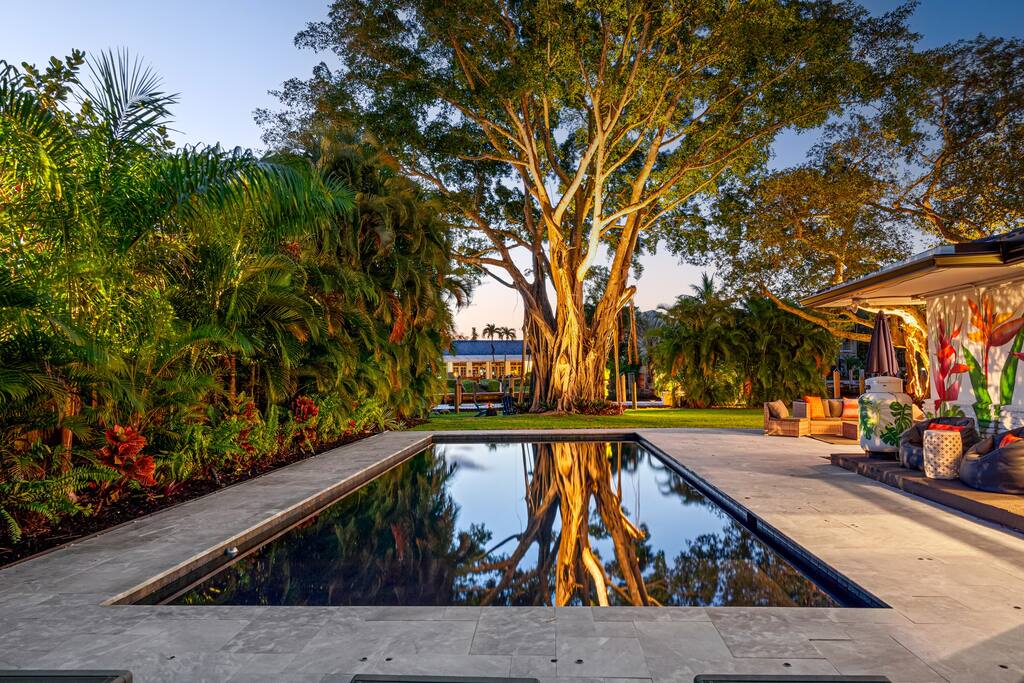 Located on an acre of waterfront property, this tropical escape is a 4 bedroom, 3 bath open floor plan home with a large screened Patio Room to relax & watch the mega yachts go by! The large Banyan trees & lush backyard includes a private heated pool, ideal for family vacations, bachelor / bachelorette parties, golf trips, beach stay (10min) or any South Florida getaways! Includes pool, fire pit, games, high speed wifi, fishing, 10min drive to Las Olas and more! We are also pet friendly!